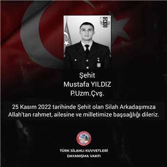 P.Uzm.Çvş. Mustafa YILDIZ 26.11.2022 Fotoğraflar Diğerleri 12.11.2025 Askeri kargo uçağı düşmesi nedeniyle 11 Kasım 2025 tari... 13.10.2025 J. Asb.Kd.Çvş. Tacettin GÜN, J.Asb.Kd.Çvş. Hakkı ERYILM... 30.09.2025 J.Asb.Çvş. Kemal ÖZGÜR Uzm.J.VI.Kad.Çvş. Arif ÖZDEMİR 18.09.2025 P.Uzm.Çvş. Hüseyin GÜNAY 20.08.2025 P.Ütğm. Nuri Melih BOZKURT 30.07.2025 Topçu Uzm.Çvş. Servet Ökkseş ÇAKIR Tümünü Gör